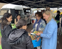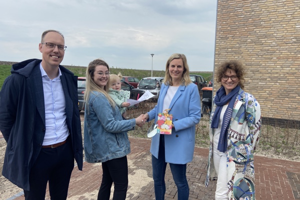 Alle aanwezige bewoners kregen een tuinpakketje met bloembollen. Het eerste pakketje reikte Dorrit uit aan bewoner Caitlyn. Zij huurt een van de woningen in het middenhuursegment. “We zijn heel blij met onze woning. Kopen lukte niet in deze markt en voor de huurwoningen kwamen we niet in aanmerking. We zijn heel blij dat deze kans voorbij kwam!”