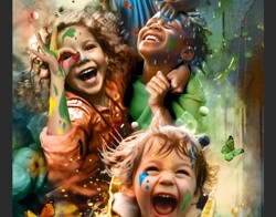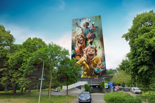 Roos: “Uit de reacties bleek dat Holtenbroek een fijne plek is om te wonen. Het is een kleurrijke wijk waar verschillende culturen samenwonen en kinderen samen spelen. De kinderen in mijn ontwerp zijn aan het lachen en spelen met verf. Zij stralen een pure vreugde uit. Zonder grenzen en onderscheid op basis van huidskleur of afkomst. De wereld door de ogen van een kind kent geen vooroordelen. Hun samenspel laat zien dat vriendschap en verbondenheid sterker zijn dan verschillen. In deze eenvoudige maar krachtige scène ligt een boodschap van hoop: dat we allemaal kunnen leren om met dezelfde onbevangenheid en liefde naar elkaar te kijken.” De volledige motivatie voor het ontwerp vind je op www.roosartpaintings.com/holtenbroek.